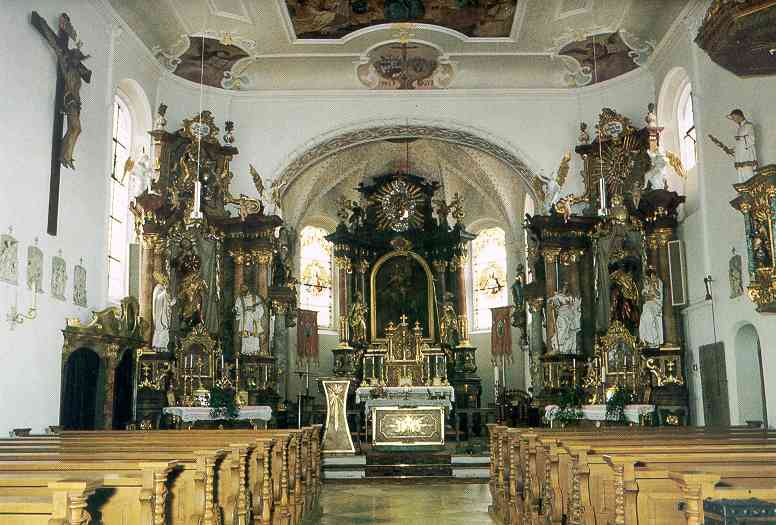 An die gotische Kirche erinnern die Strebepfeiler außen am Chor, der spitzbogige Ausschnitt des Ostfensters, das Tonnengewölbe des Chores und ein sehr guter, lebensgroßer Kruzifix (um 1490). Altäre, Stuck, Ausmalung, Kanzel, Gestühl und Holzfiguren stammen aus der 1. Hälfte des 18. Jahrhunderts und geben das barocke Gepräge. Portal, Chorbogen und Schiffsfenster sind segmentbogig; die Chorfenster - mit Ausnahme des Ostfensters - wurden entsprechend "barockisiert". Spätere Zutaten sind im wesentlichen der Beichtstuhl (um 1780), die beiden klassizistischen Prozessionsstangen, die Figuren der Hl. Aloysius und Johann Nepomuk (um 1800), die Doppelempore (1843 statt einfacher Empore wegen Raumgewinn), der Turmhelm von 1931, die Orgel (1932) und das weniger gelungene Christkönigsbild an der Brüstung der oberen Empore von 1961 (früher Orgelpfeifen an der mittleren Front). Bedeutende Restaurierungen erfolgten 1893, 1935/36 und 1978/79.